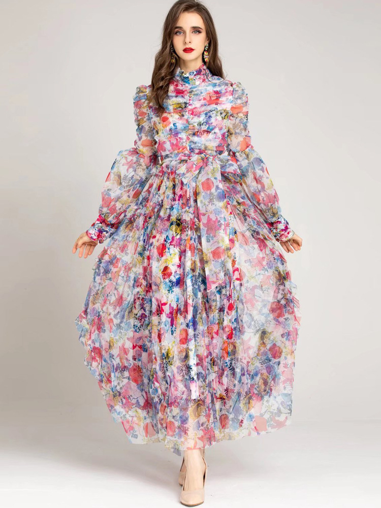 Summer Designer Fashion long dress for women Lantern sleeve vintage Folds mesh print Patch Designs ruffles maxi dress