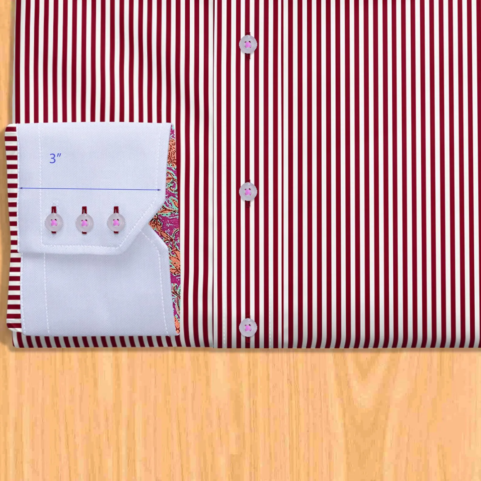 - Buttonholes/Thread: Dark red buttonholes + pink button thread