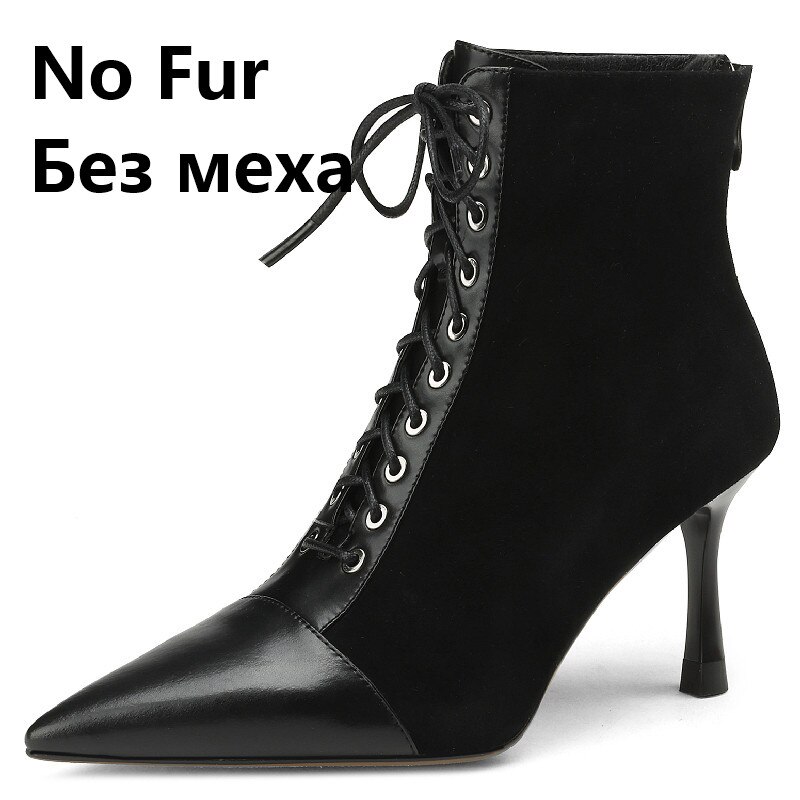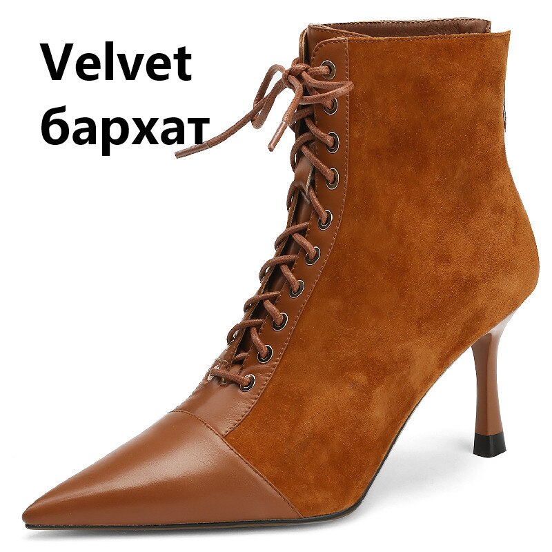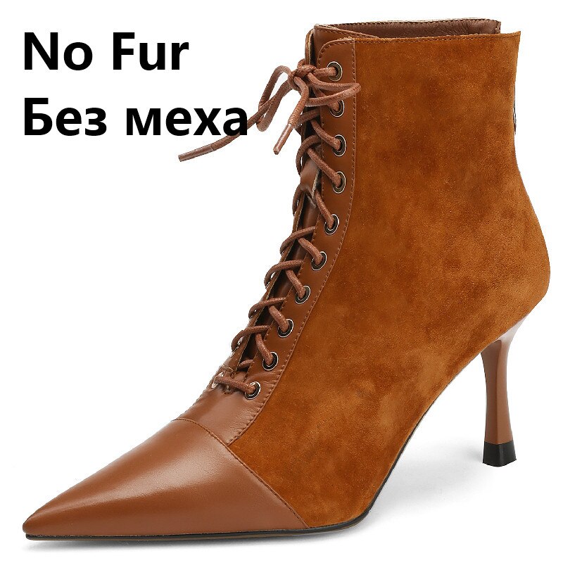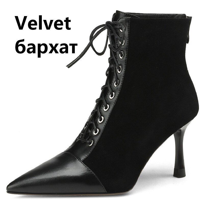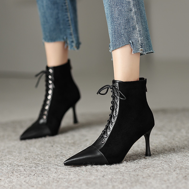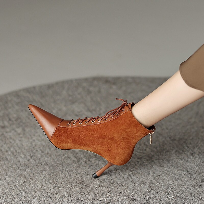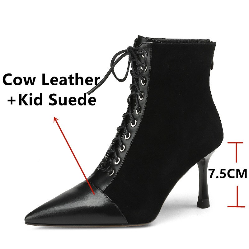 Mature Elegant Women Ankle Boots Pointed Toe Thin High Heels Female Office Genuine Leather Cross-Tied Shoes Woman